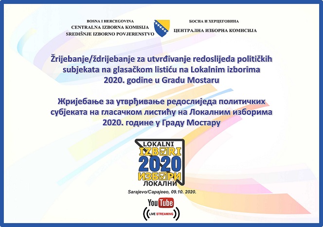 U skladu sa Izbornim zakonom BiH i Uputstvom o postupku žrijebanja političkih subjekata za utvrđivanje redoslijeda na glasačkom listiću Centralna izborna komisija BiH će sutra, 09.10.2020. godine sa početkom u 11 sati u sjedištu Centralne izborne komisije BiH u Sarajevu organizirati žrijebanje političkih subjekata za utvrđivanje redoslijeda na glasačkom listiću na Lokalnim izborima 2020. godine u Gradu Mostaru.