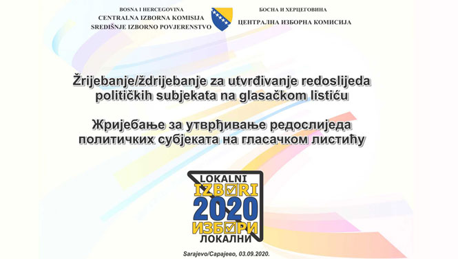 U skladu sa Izbornim zakonom BiH i Uputstvom o postupku žrijebanja političkih subjekata za utvrđivanje redoslijeda na glasačkom listiću Centralna izborna komisija BiH će sutra, 03.09.2020. godine sa početkom u 11 sati u sjedištu Centralne izborne komisije BiH u Sarajevu organizirati žrijebanje političkih subjekata za utvrđivanje redoslijeda na glasačkom listiću.