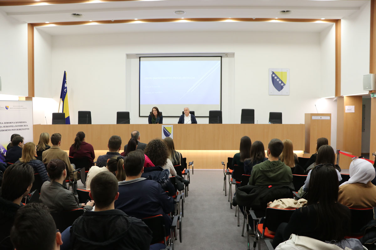 Sarajevo,29.03.2019 godine – Grupa od 60 studenata druge godine Pravnog fakulteta Univerziteta u Sarajevu, sa Doc dr Lejlom Balić na čelu, danas je posjetila Centralnu izbornu komisiju BiH.